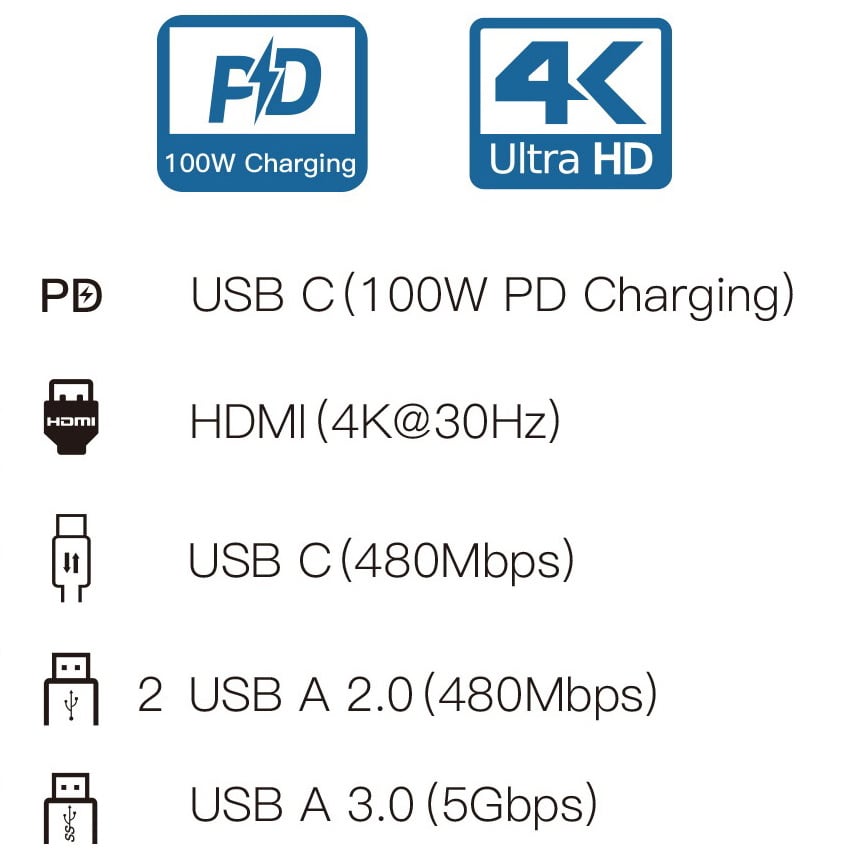 • Includes 2 USB-A 2.0 ports, 1 USB-A 3.0 port, and 2 USB-C ports